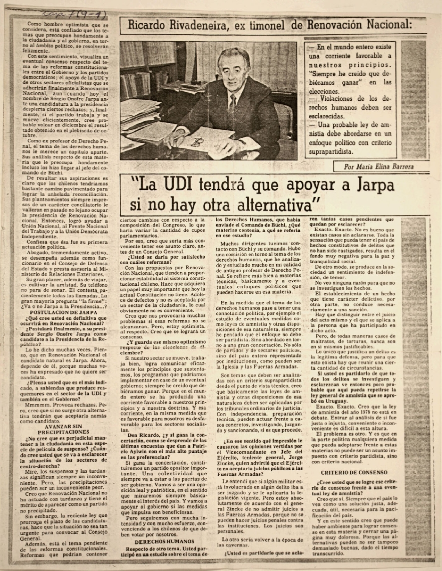 Ricardo Rivadeneira, ex timonel de Renovación Nacional "La UDI tendrá que apoyar a Jarpa si no hay otra alternativa