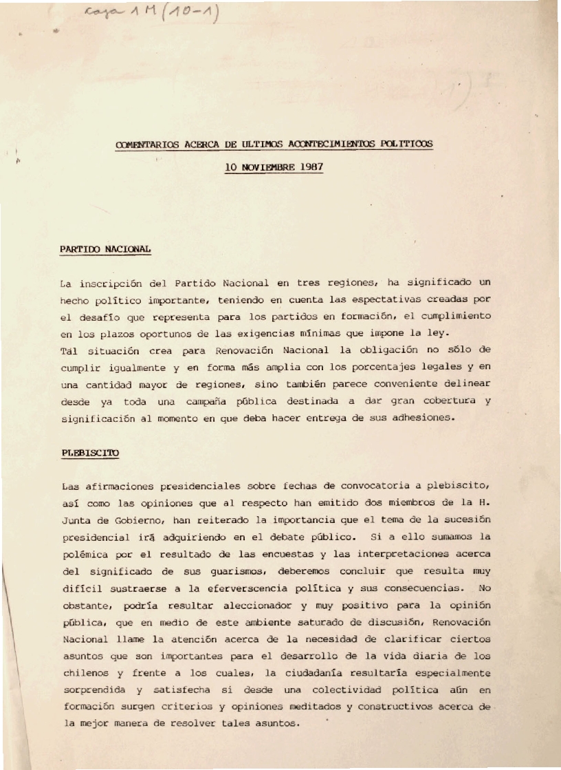 Comentarios acerca de los últimos acontecimientos políticos 10 de noviembre de 1987