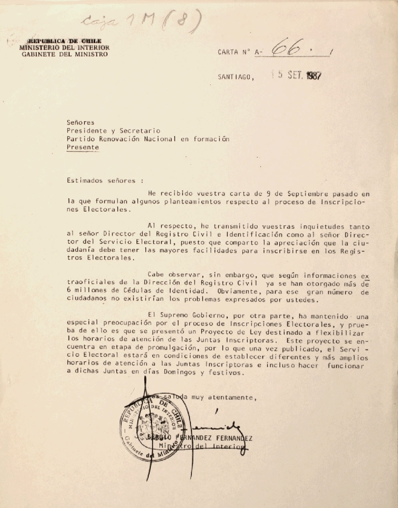 Carta de Sergio Fernández como Ministro del Interior