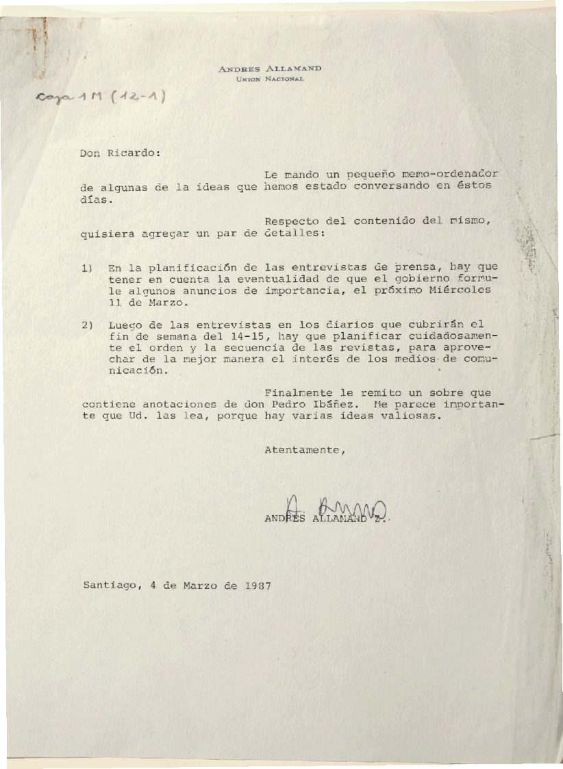 Pauta ordenadora de ideas ya conversadas que adjunta documento de apoyo para entrevistas de prensa y memorandum Nª 1 personal y reservado