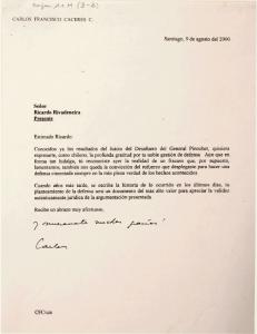 Carta agradecimiento por la noble gestión de defensa del general Pinochet