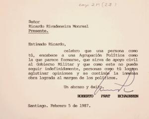 Tarjeta dirigida a Ricardo Rivadeneira Monreal como Presidente del Partido Renovación Nacional