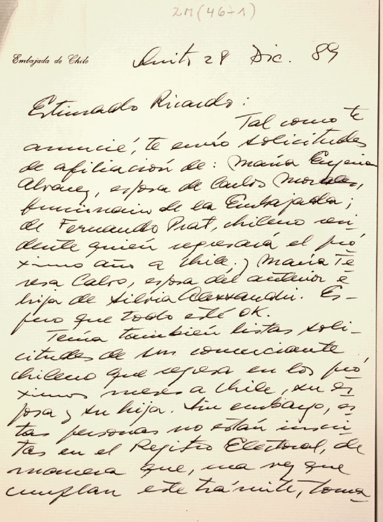 Carta dirigida a Ricardo Rivadeneira, Presidente del Partido Renovación Nacional