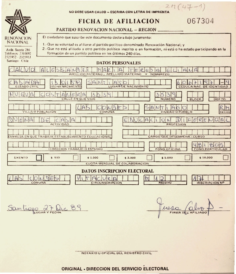 Ficha tipo de afiliación al Partido Renovación Nacional de María Teresa Eliana Calvo Alessandri