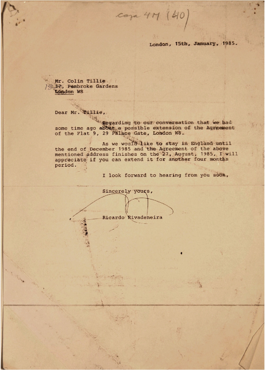 Conjunto de cartas escritas en Londres por Ricardo Rivadeneira dirigidas a Colin Tillie, quien les arrendó el departamento donde vivía con su familia. Contiene además el contrato de arrendamiento, formulario de pago, y carta manuscrita de Colin Tillie dirigida a Ricardo Rivadeneira