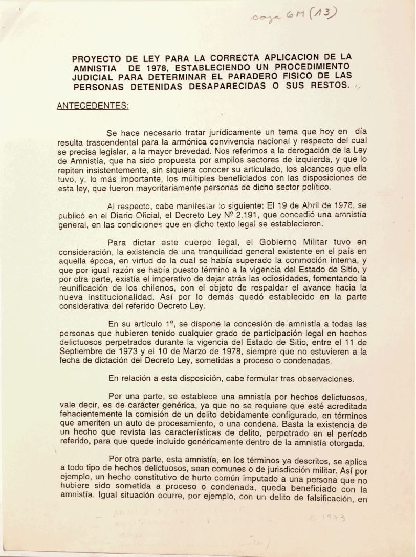 Proyecto de ley para la correcta aplicación de la amnistía de 1978, estableciendo un procedimiento judicial para determinar el paradero físico de las personas detenidas desaparecidas o sus restos