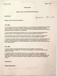 Contiene legislación respecto a : Delitos contra la Comunidad Internacional : delitos contra el derecho de gentes, delitos de genocidio, delitos contra las personas y bienes protegidos en caso de conflicto armado