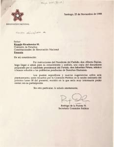 Informa envío de documento "Bases para una propuesta relativa al tratamiento judicial de casos de Derechos Humanos ocurridas en el pasado" de Sebastian Piñera, para conocimiento y análisis en sesión extraordinaria de la Comisión Política.