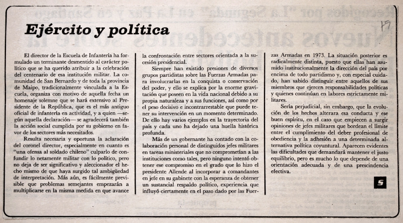 El Director de la Escuela de Infantería de San Bernardo ha declarado que es una ofensa al soldado chileno al querer atribuir caracter político a la celebración del centenario de la institución haciendo un homenaje al Presidente de la República
