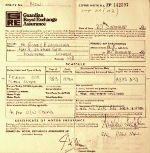 Certificado de seguro auto Peugot contratado por Ricardo Rivadeneira en Londres