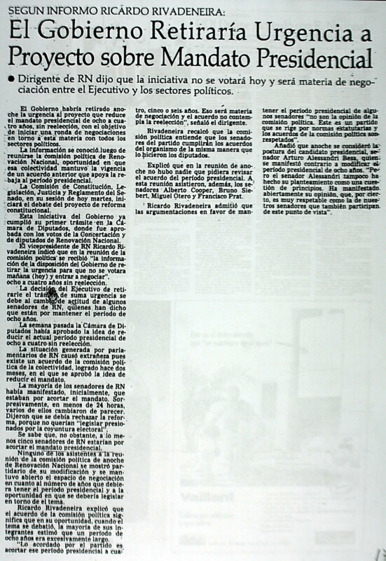 Según informó Ricardo Rivadeneira gobierno retiraría urgencia a proyecto sobre mandato presidencial