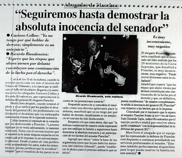 Abogados de Pinochet: seguiremos hasta demostrar la absoluta inocencia del senador