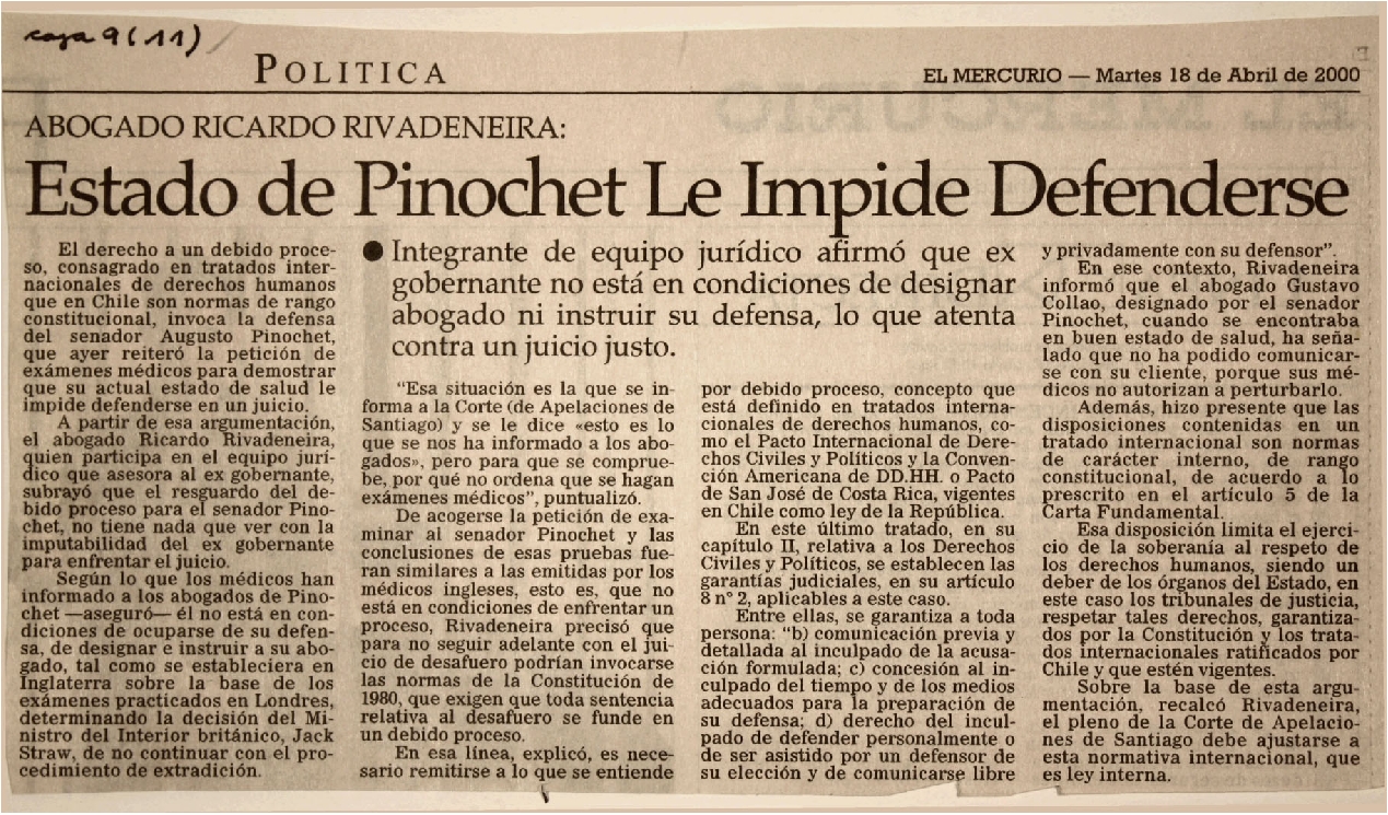 Estado de Pinochet le impide defenderse : abogado Ricardo Rivadeneira
