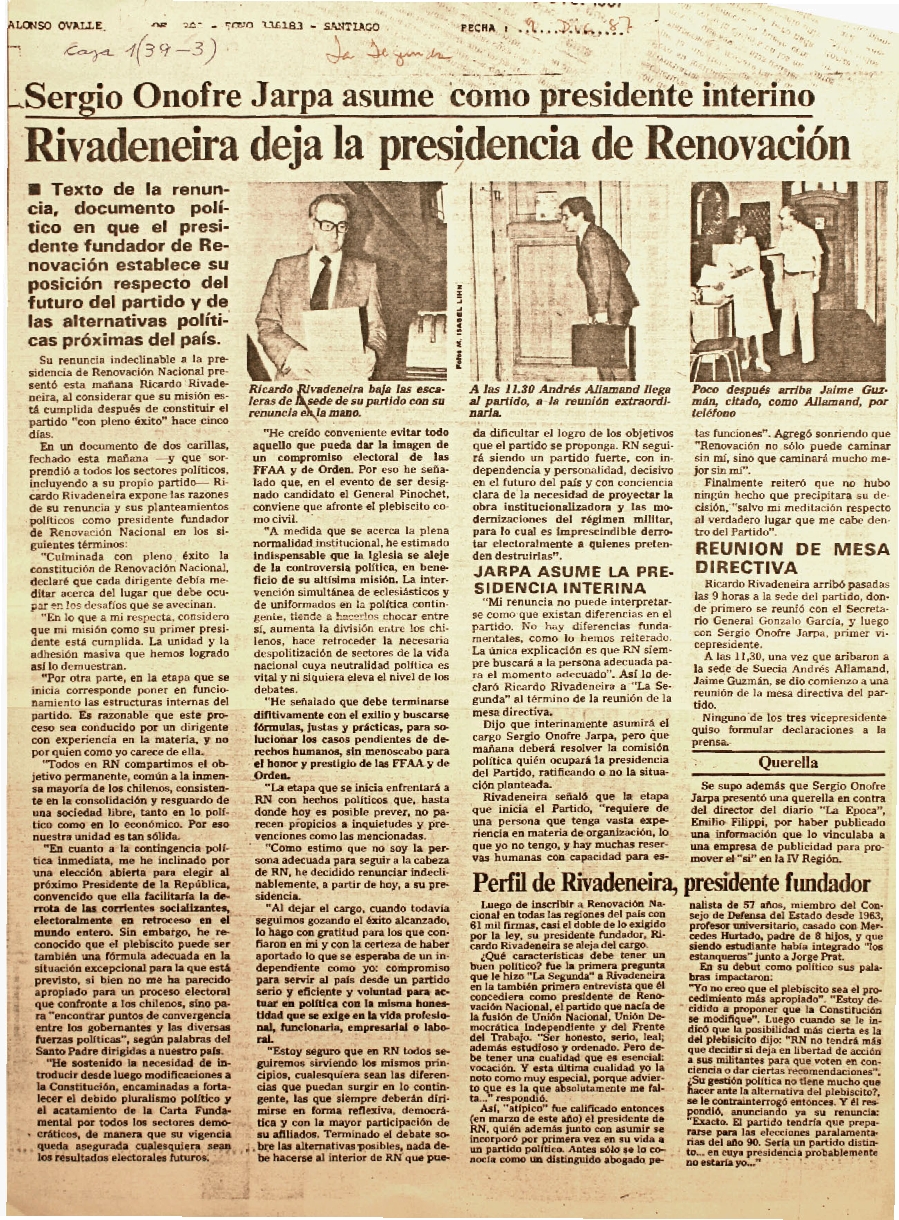 Rivadeneira deja la presidencia de Renovación Nacional; Sergio Onofre Jarpa asume como presidente interino
