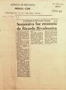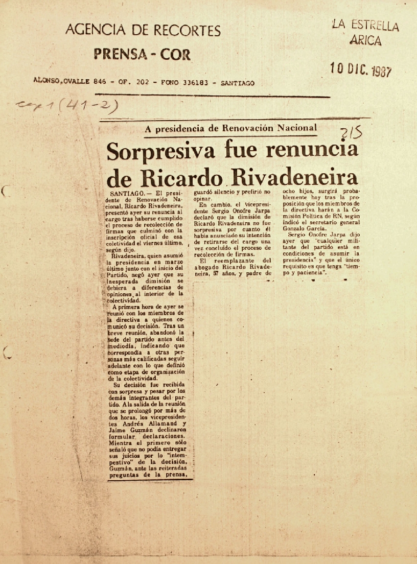 Carta de renuncia de Ricardo Rivadeneira a Sergio Onofre Jarpa como Vicepresidente del Partido Renovación Nacional en Caja 2 M ( 58 )