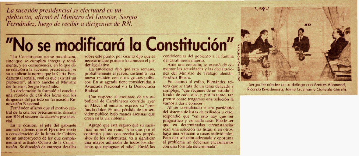 La sucesión presidencial se efectuará en un plebiscito, afirmó el Ministro del Interior, Sergio Fernández, luego de recibir a dirigentes de RN.