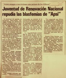 Juventud de Renovación Nacional repudia las blasfemias de "Apsi"