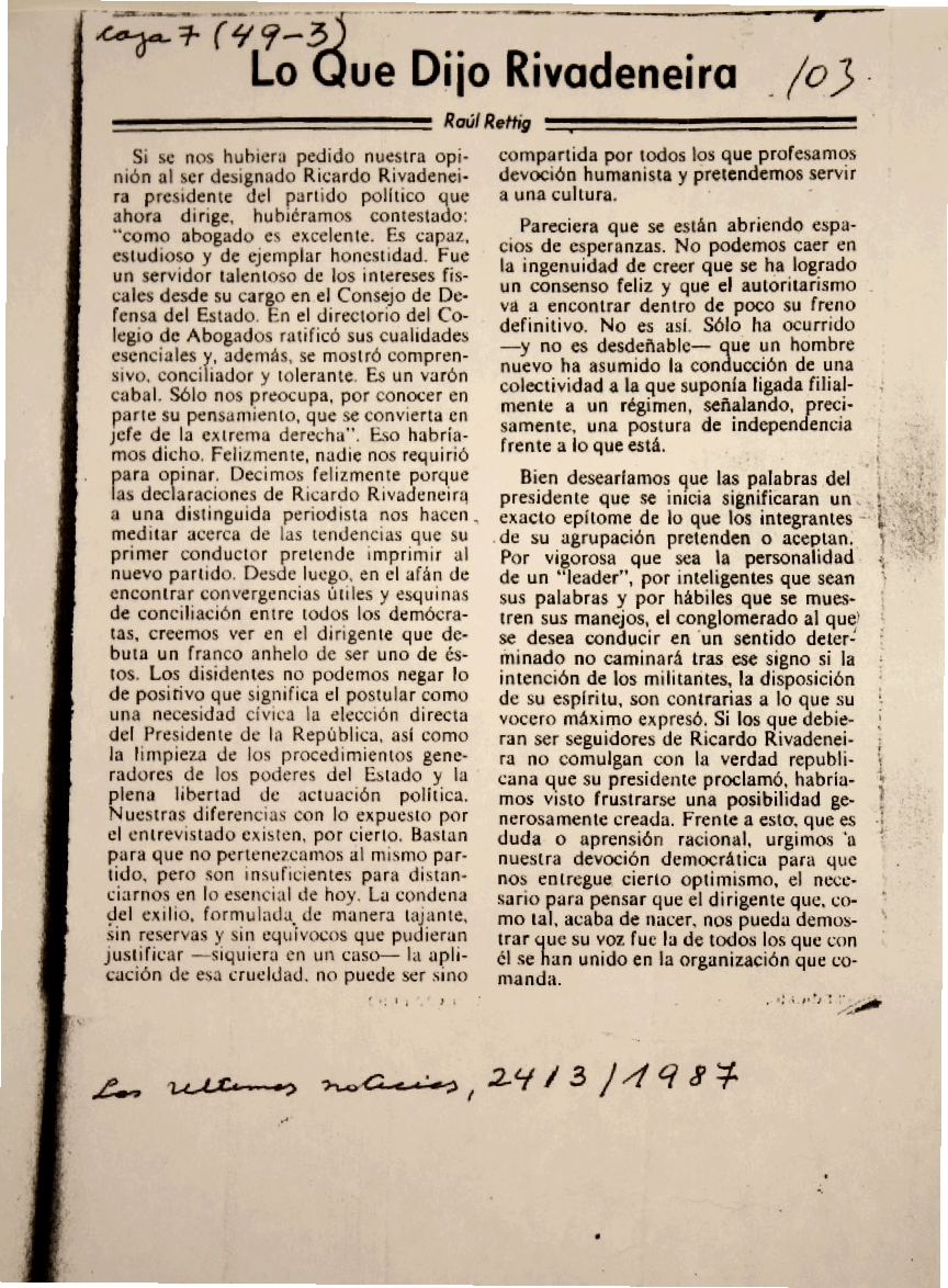 Las Ultimas Noticias, Santiago, 24 de marzo de 1987.