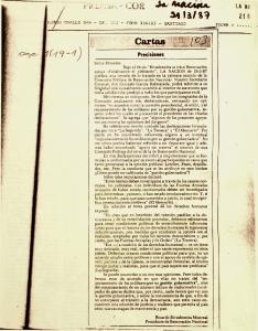 Carta respuesta de Ricardo Rivadeneira al Diario La Nación, donde aclara y rectifica lo publicado el 19 de marzo de 1987 donde se afirma que en la Primera Reunión de la Comisión Política se analizaron sus declaraciones versadas sobre exilio, sucesión presidencial, y el enjuiciamiento de los militares en su gestión gubernativa.