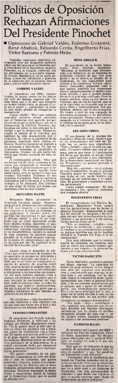 Reacciones de políticos de oposición frente a las palabras de A. Pinochet que la oposición ha fracazado.