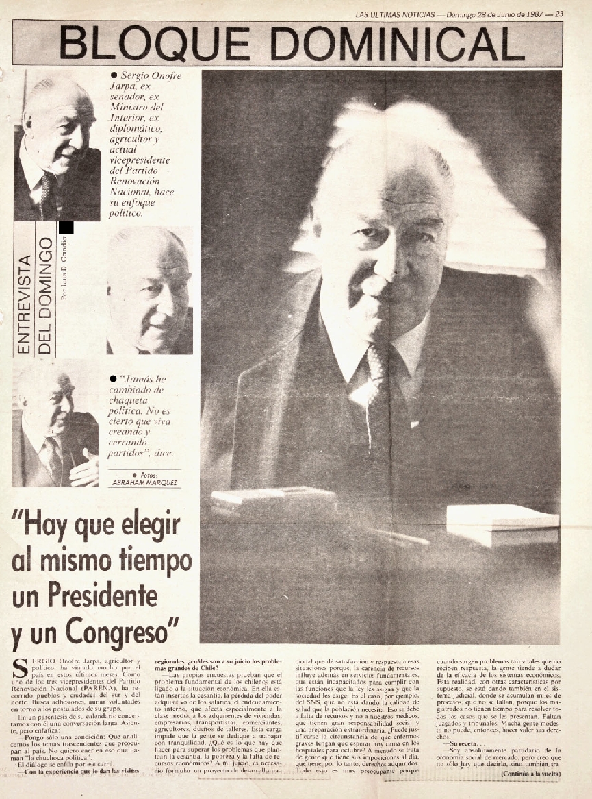 Sergio Onofre Jarpa, ex senador, ex Ministro del Interior, ex diplomático, agricultor y actual vicepresidente del Partido Renovación Nacional, hace su enfoque político. "Jamás he cambiado de chaqueta política. No es cierto que viva creando y cerrando partidos", dice.