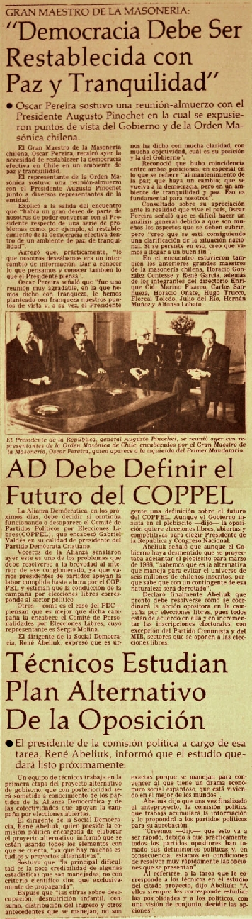 Oscar Pereira sostuvo una reunión-almuerzo con el Presidente Augusto Pinochet en la cual expusieron puntos de vista del Gobierno y de la Orden Masónica chilena.