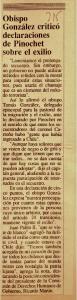 » Obispo González criticó declaraciones de Pinochet sobre el exilio