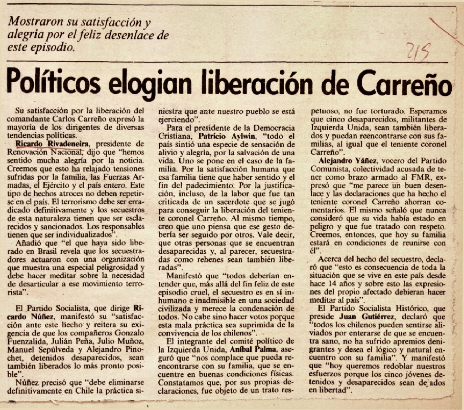 La mayoría de los dirigentes de diversas tendencias políticas expresaron su satisfacción por la liberación de Carreño.