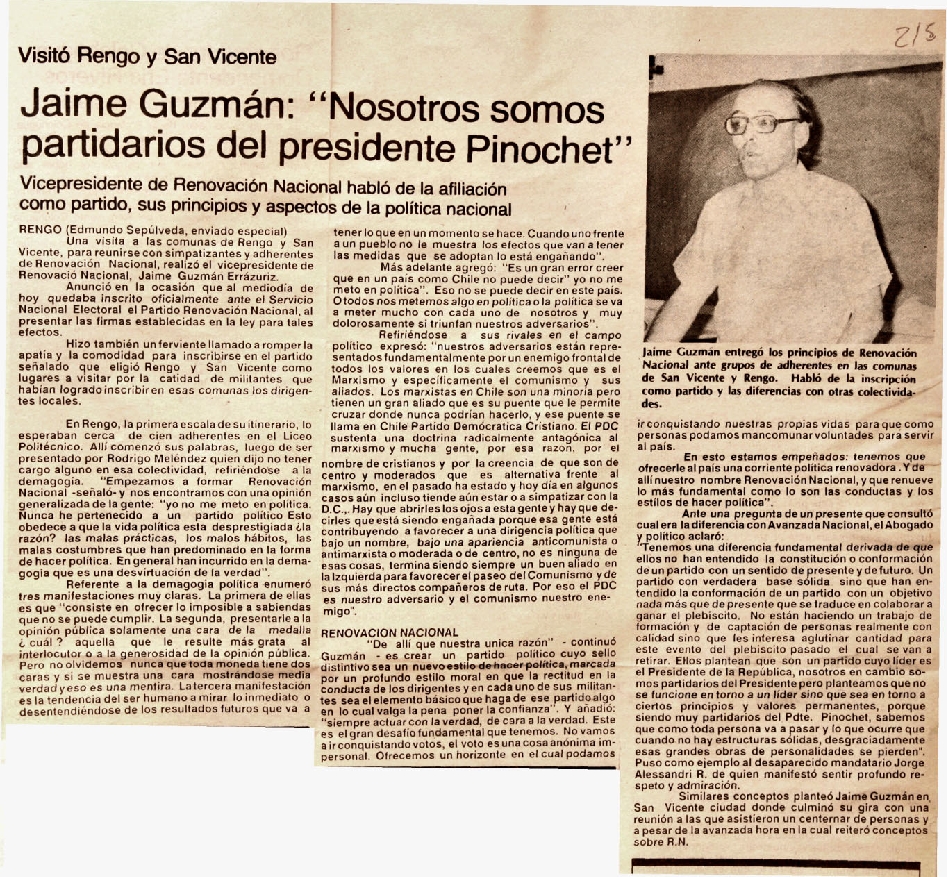 Jaime Juzmán: "Nosotros somos partidarios del presidente Pinochet"