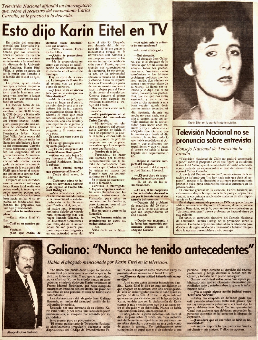 Televisión Nacional difundió un interrogatorio que, sobre el secuestro del comandante Carlos Carreño, se le practicó a la detenida.