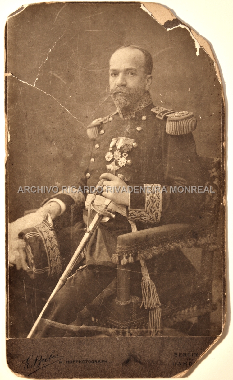 El retratado se encuentra sentado con traje militar, luciendo condecoraciones y espada.