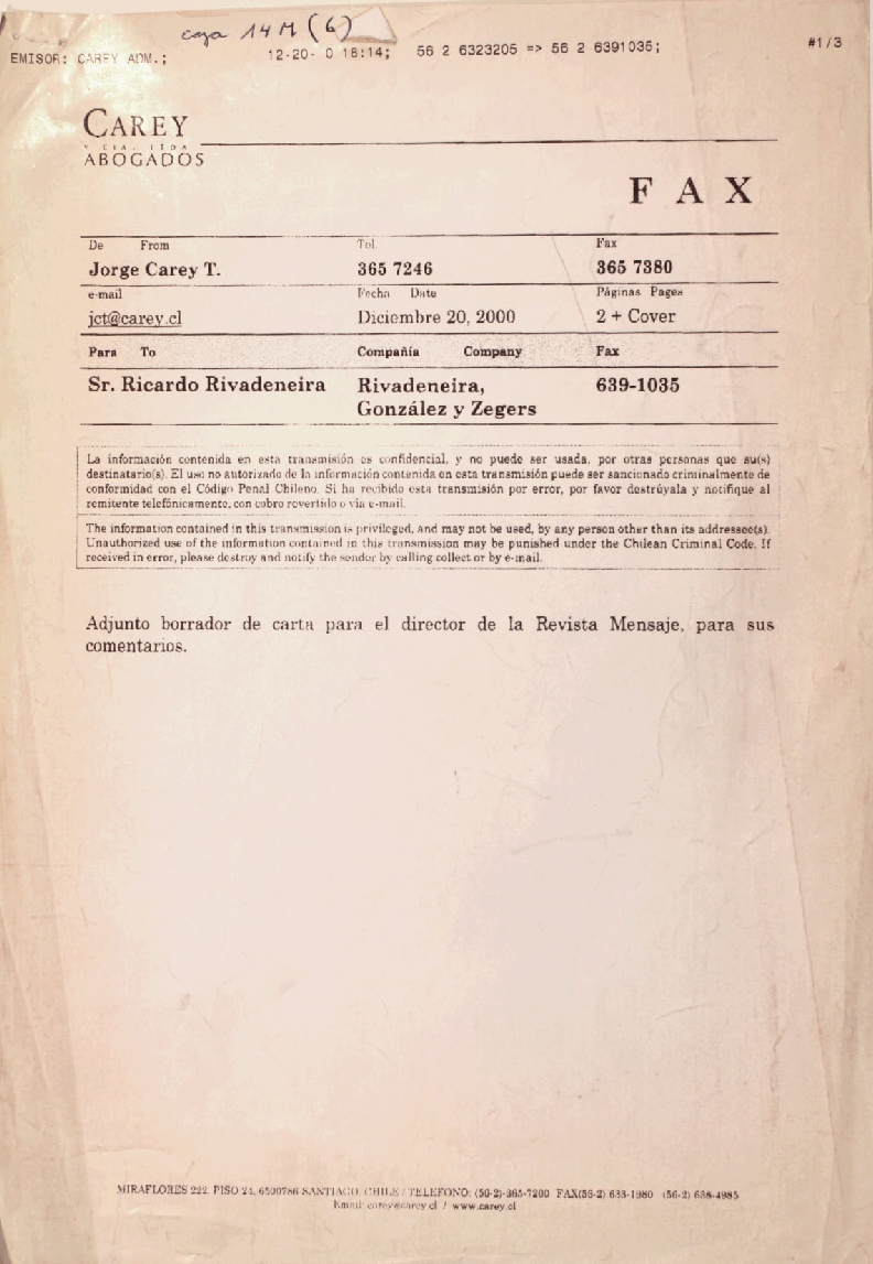 Felicitaciones al Director de la Revista Mensaje por la Editorial del mes de diciembre donde manifiesta que la derecha chilena no ha condenado los actos de barbarie como el cometido en contra del carpintero Señor Alegría, adjunta cartas que Ricardo Rivadeneira ha escrito condenando estos actos, las cartas no se encuentran adjuntas.