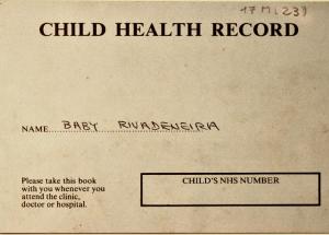 El folleto es la libreta control de salud de Tomás Rivadeneira, hijo de Ricardo Rivadeneira y Mercedes Hurtado que naciò en Londres