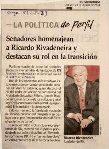 Senadores homenajean a Ricardo Rivadeneira y destacan su rol en la transición