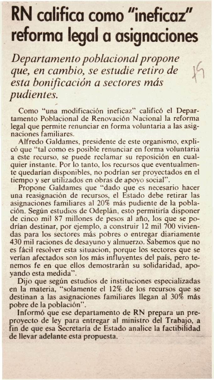 Departamento poblacional propone que en cambio, se estudie retiro de bonificación familiar a sectores más pudientes.