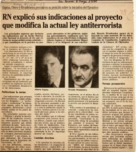 R. N. explicó sus indicaciones al proyecto que modifica la actual ley antiterrorista : Espina, Otero y Rivadeneira precisaron su posición sobre iniciativa del Ejecutivo