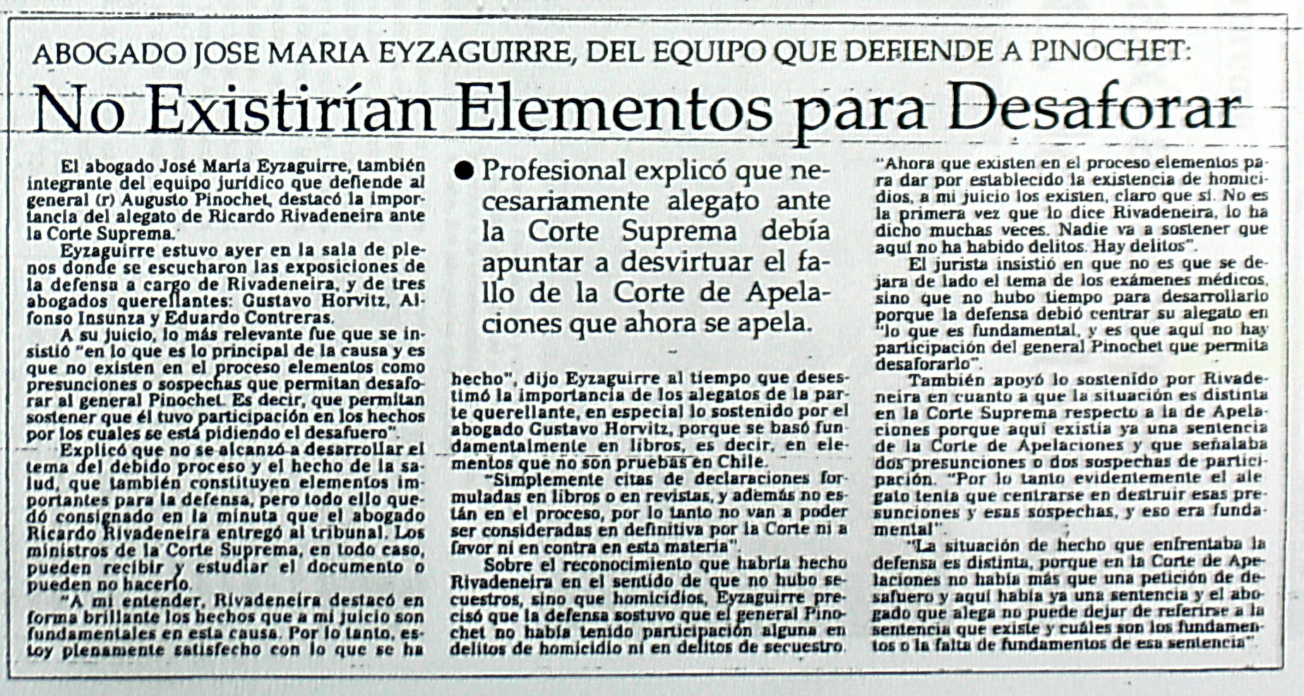 Abogado José María Eyzaguirre, del equipo que defiende a Pinochet; No existirían elementos para desaforar