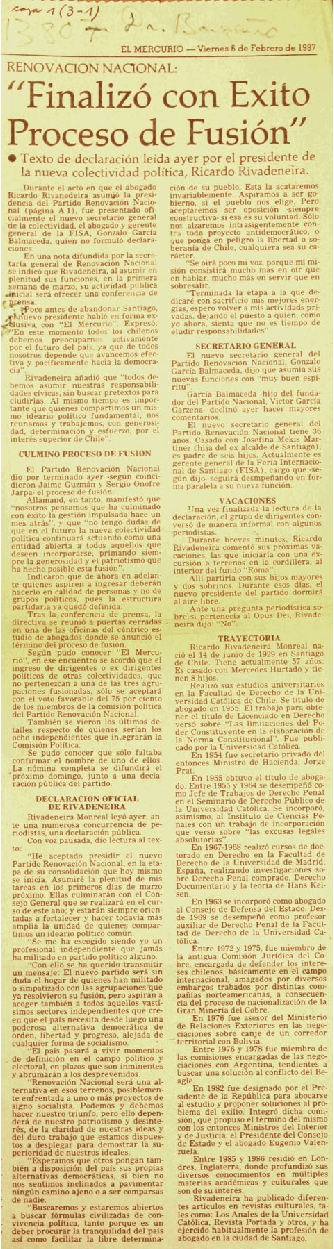 Renovación Nacional "Finalizó con éxito proceso de fusión" Texto de declaración leída ayer por el presidente de la nueva colectividad política , Ricardo Rivadeneira"