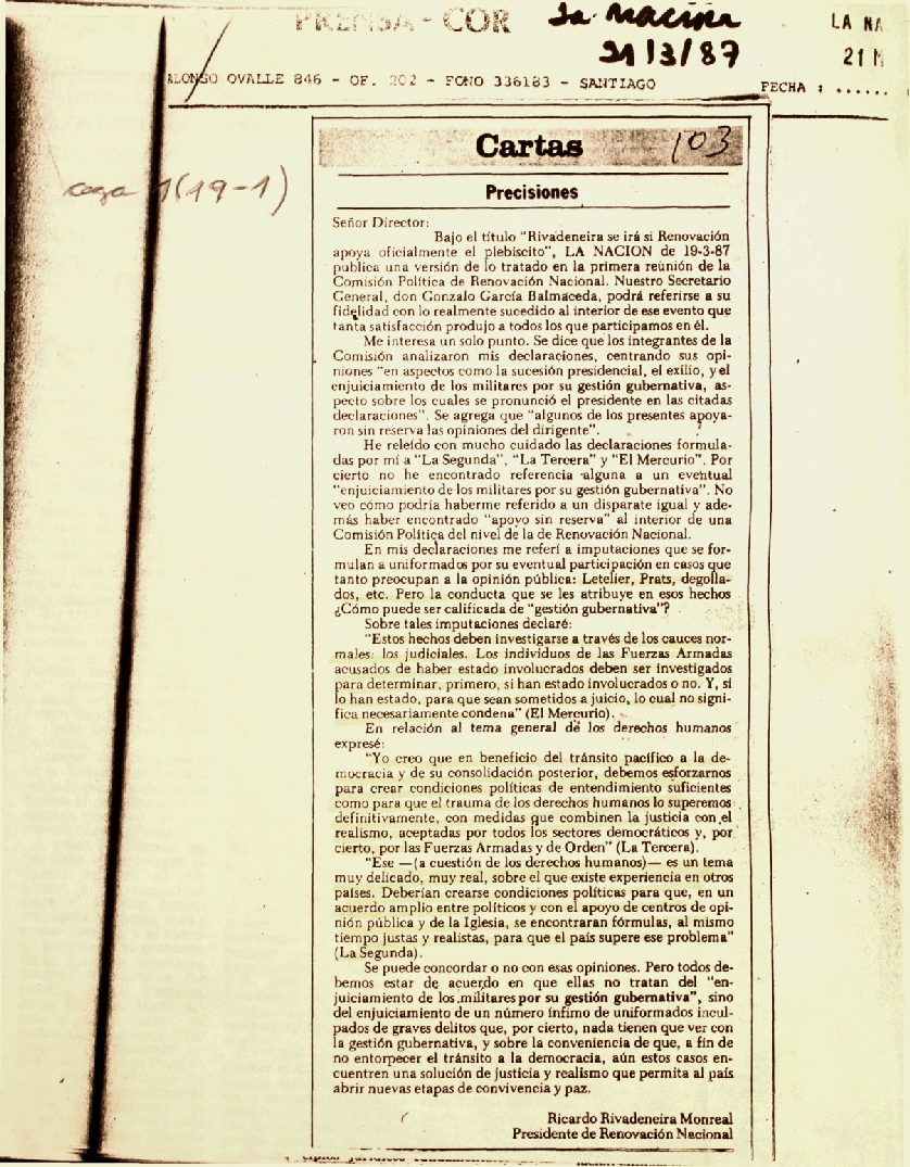 Sin dato, posiblemente La Nación, Santiago, marzo de 1987.