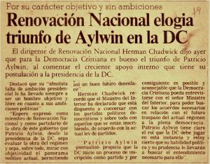 El dirigente de Renovación Nacional Hernán Chadwick dijo ayer que para la Democracia Cristiana es bueno el triunfo de Patricio Aylwin, al comentar el creciente apoyo interno que tiene su postulación a la presidencia de la DC.