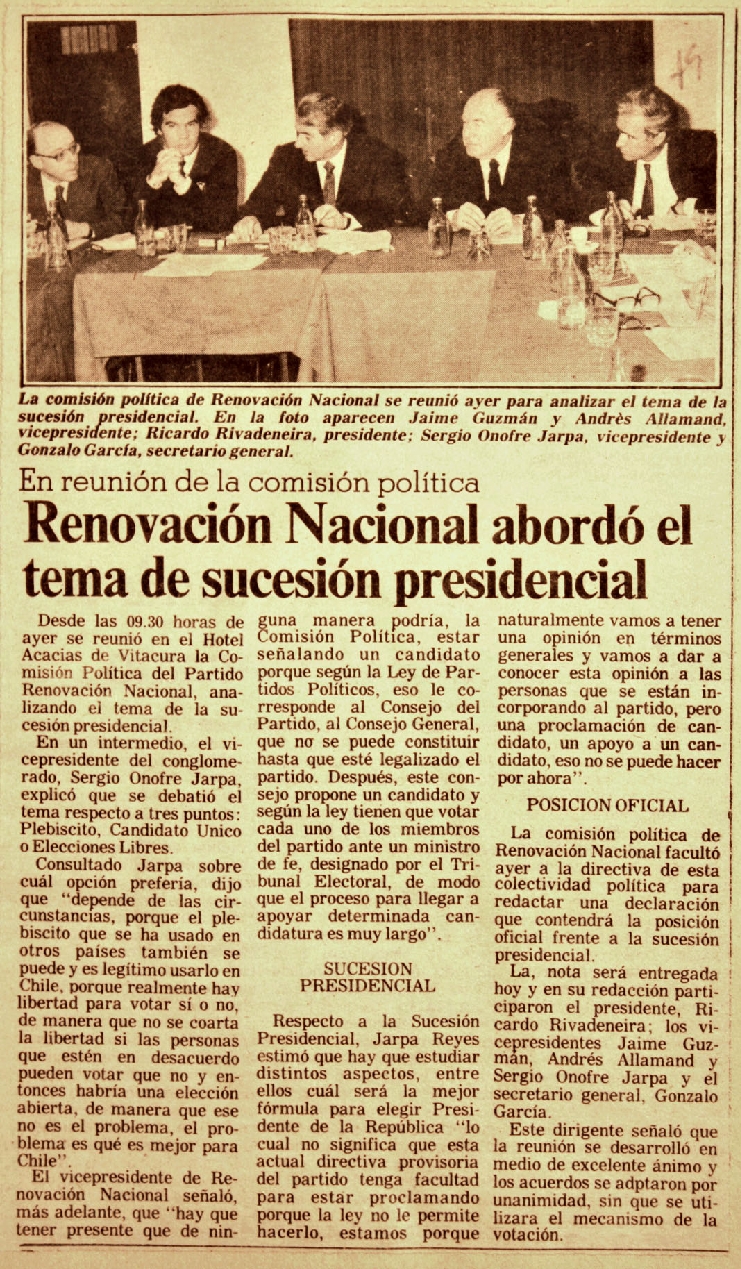 Se reunió ayer para analizar el tema de la sucesión presidencial. Jaime Guzmán y Andrés Allamand, vivcepresidente; Ricardo Rivadeneira, presidente; Segio Onofre Jarpa, vicepresidente y Gonzalo García, secretario general.