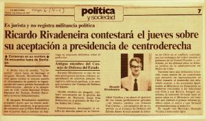 Título secundario Ricardo Rivadeneira contestará el jueves sobre aceptación a presidencia de centroderecha