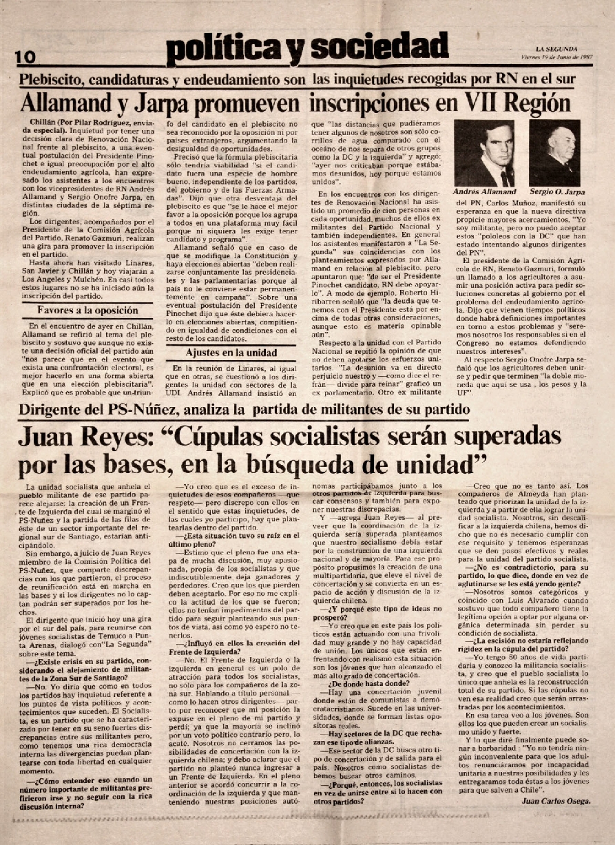 Inquietud por tener una decisión clara de Renovación Nacional frente al plebiscito, a una eventual postulación del Presidente Pinochet e igual preocupación por el alto endeudamiento agrícola, han expresado los asistentes a los encuentros con los vicepresidentes de RN Andrés Allamand y Sergio Onofre Jarpa, en las distintas ciudades de la séptima región.