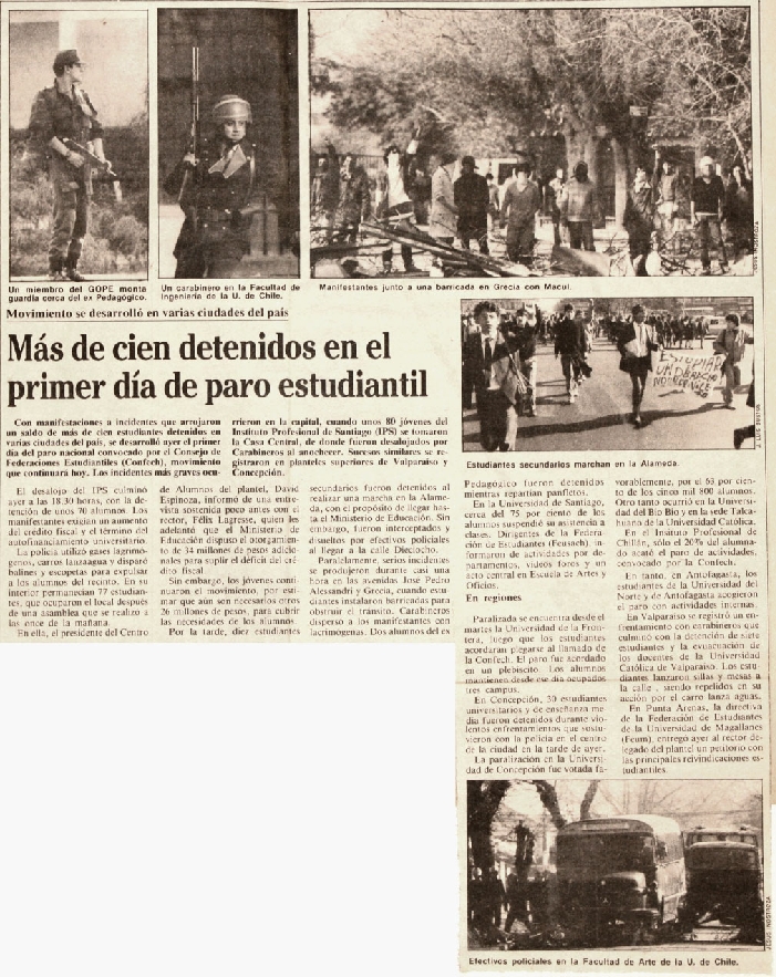 Con manifestaciones a incidentes que arrojaron un saldo de más de cien estudiantes detenidos en varias ciudades del país, se desarrolló ayer el primer día de paro nacional convocado por el Consejo de Federaciones Estudiantiles (Confech), movimiento que continuará hoy. Los incidentes más graves ocurrieron en la capital, cuando unos 80 jóvenes del Instituto Profesional de Santiago (IPS) se tomaron la Casa Central, de donde fueron desalojados por Carabineros al anochecer. Sucesos similares se registraron en planteles superiores de Valparaíso y Concepción.
