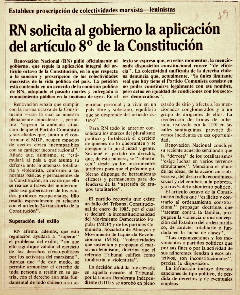RN solicita al gobierno la aplicación del artículo 8° de la Constitución.
