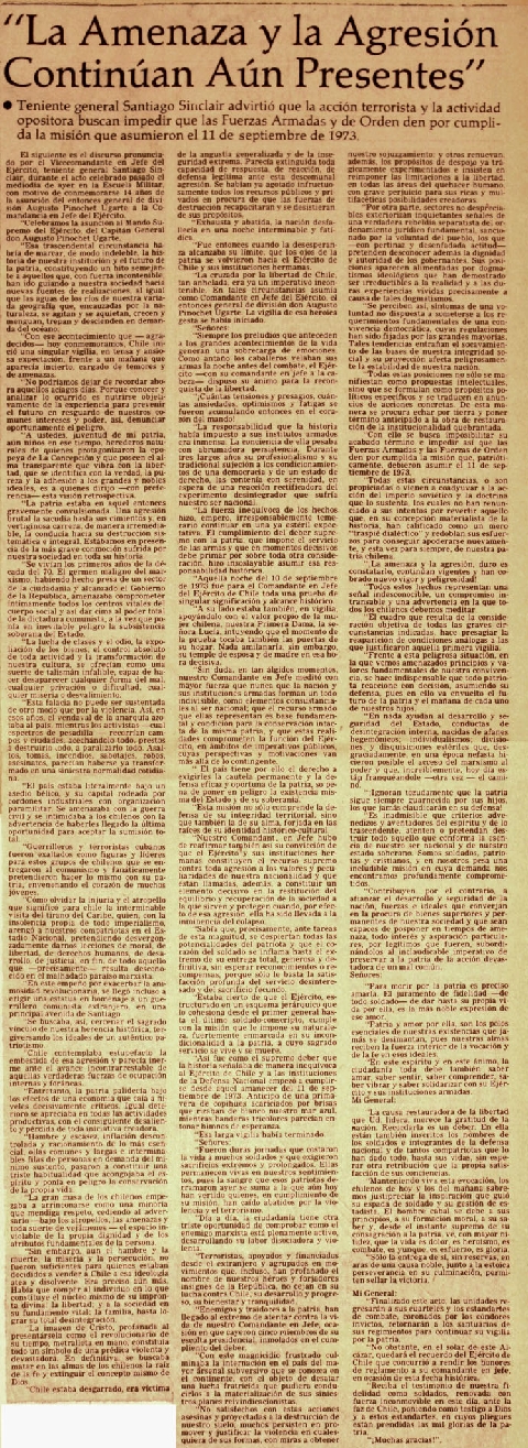 Teniente general Santiago Sinclair advirtió que la acción terrorista y la actividad opositora buscan impedir que las Fuerzas Armadas y de Orden den por cumplida la misión que asumieron el 11 de septiembre de 1973.
